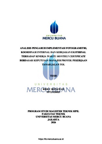 SETIAWAN, RISKY (2026) ANALISIS PENGARUH IMPLEMENTASI FOTOGRAMETRI, KOORDINASI INTERNAL DAN KEBIJAKAN EKSTERNAL TERHADAP KINERJA WAKTU MONTHLY CERTIFICATE BERDASAR KEPUTUSAN MANAJER PROYEK PEKERJAAN TANAH JALAN TOL. S2 thesis, Universitas Mercu Buana Jakarta.