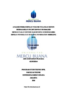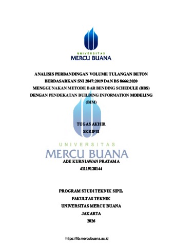 PRATAMA, ADE KURNIAWAN (2026) ANALISIS PERBANDINGAN VOLUME TULANGAN BETON BERDASARKAN SNI 2847:2019 DAN BS 8666:2020 MENGGUNAKAN METODE BAR BENDING SCHEDULE (BBS) DENGAN PENDEKATAN BUILDING INFORMATION MODELING (BIM). S1 thesis, Universitas Mercu Buana Jakarta.
