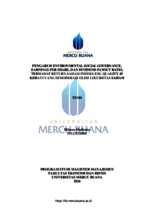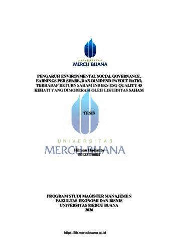 HADIANTO, HILMAN (2026) PENGARUH ENVIRONMENTAL SOCIAL GOVERNANCE, EARNINGS PER SHARE, DAN DIVIDEND PAYOUT RATIO, TERHADAP RETURN SAHAM INDEKS ESG QUALITY 45 KEHATI YANG DIMODERASI OLEH LIKUIDITAS SAHAM. S2 thesis, Universitas Mercu Buana Jakarta.