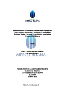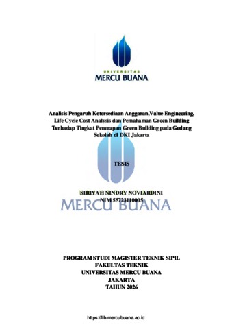 NOVIARDINI, SIRIYAH NINDRY (2026) ANALISIS PENGARUH KETERSEDIAAN ANGGARAN,VALUE ENGINEERING, LIFE CYCLE COST ANALYSIS DAN PEMAHAMAN GREEN BUILDING TERHADAP TINGKAT PENERAPAN GREEN BUILDING PADA GEDUNG SEKOLAH DI DKI JAKARTA. S2 thesis, Universitas Mercu Buana Jakarta.