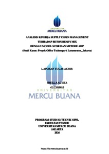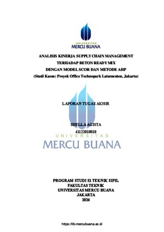 AGISTA, SHELLA (2026) ANALISIS KINERJA SUPPLY CHAIN MANAGEMENT TERHADAP BETON READY MIX DENGAN MODEL SCOR DAN METODE AHP (Studi Kasus: Proyek Office Technopark Latumenten, Jakarta). S1 thesis, Universitas Mercu Buana Jakarta.