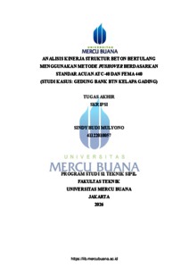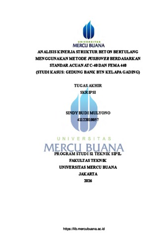MULYONO, SINDY BUDI (2026) ANALISIS KINERJA STRUKTUR BETON BERTULANG MENGGUNAKAN METODE PUSHOVER BERDASARKAN STANDAR ACUAN ATC-40 DAN FEMA 440 (STUDI KASUS: GEDUNG BANK BTN KELAPA GADING). S1 thesis, Universitas Mercu Buana Jakarta.