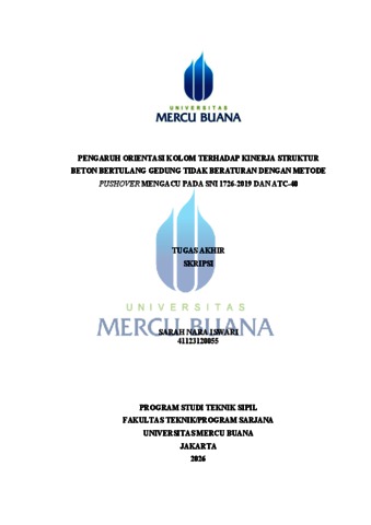 ISWARI, SARAH NARA (2026) PENGARUH ORIENTASI KOLOM TERHADAP KINERJA STRUKTUR BETON BERTULANG GEDUNG TIDAK BERATURAN DENGAN METODE PUSHOVER MENGACU PADA SNI 1726-2019 DAN ATC-40. S1 thesis, Universitas Mercu Buana Jakarta.