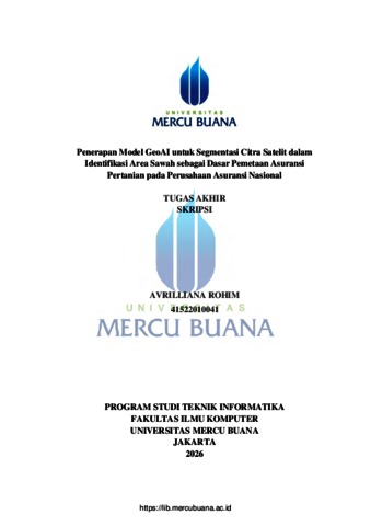 ROHIM, AVRILLIANA (2026) PENERAPAN MODEL GEOAI UNTUK SEGMENTASI CITRA SATELIT DALAM IDENTIFIKASI AREA SAWAH SEBAGAI DASAR PEMETAAN ASURANSI PERTANIAN PADA PERUSAHAAN ASURANSI NASIONAL. S1 thesis, Universitas Mercu Buana Jakarta.