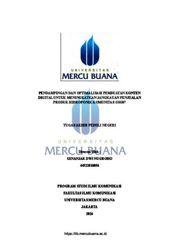NUGROHO, GINANJAR DWI (2026) PENDAMPINGAN DAN OPTIMALISASI PEMBUATAN KONTEN DIGITAL UNTUK MENINGKATKAN JANGKAUAN PENJUALAN PRODUK HIDROPONIK KOMUNITAS GSG07. S1 thesis, Universitas Mercu Buana Jakarta.