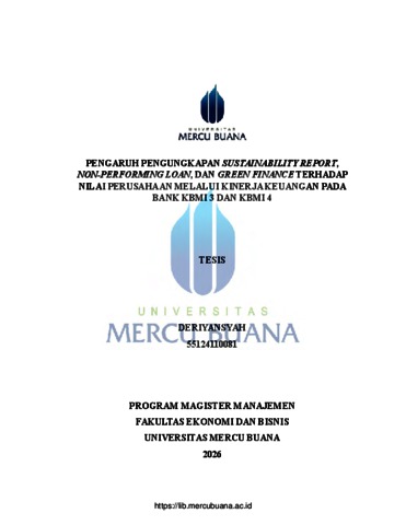 DERIYANSYAH, DERIYANSYAH (2026) PENGARUH PENGUNGKAPAN SUSTAINABILITY REPORT, NON-PERFORMING LOAN, DAN GREEN FINANCE TERHADAP NILAI PERUSAHAAN MELALUI KINERJA KEUANGAN PADA BANK KBMI 3 DAN KBMI 4. S2 thesis, Universitas Mercu Buana Jakarta.