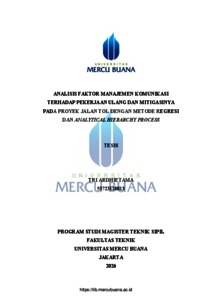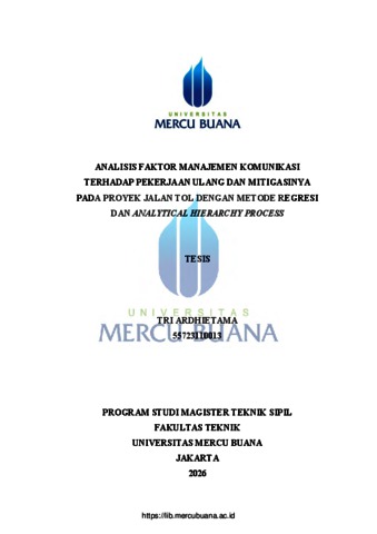 ARDHIETAMA, TRI (2026) ANALISIS FAKTOR MANAJEMEN KOMUNIKASI TERHADAP PEKERJAAN ULANG DAN MITIGASINYA PADA PROYEK JALAN TOL DENGAN METODE REGRESI DAN ANALYTICAL HIERARCHY PROCESS. S2 thesis, Universitas Mercu Buana Jakarta.