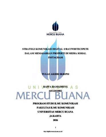 RAMADHINA, RAFFA (2026) STRATEGI KOMUNIKASI DIGITAL @RAYWHITECIPETE DALAM MEMASARKAN PROPERTI DI MEDIA SOSIAL INSTAGRAM. S1 thesis, UNIVERISTAS MERCU BUANA - BUNCIT.