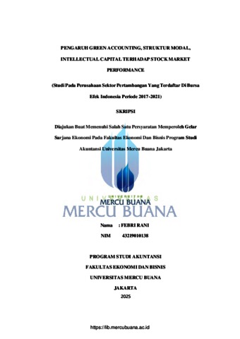 RANI, FEBRI (2025) PENGARUH GREEN ACCOUNTING, STRUKTUR MODAL, INTELLECTUAL CAPITAL TERHADAP STOCK MARKET PERFORMANCE (Studi Pada Perusahaan Sektor Pertambangan Yang Terdaftar Di Bursa Efek Indonesia Periode 2017-2021). S1 thesis, Universitas Mercu Buana Jakarta.