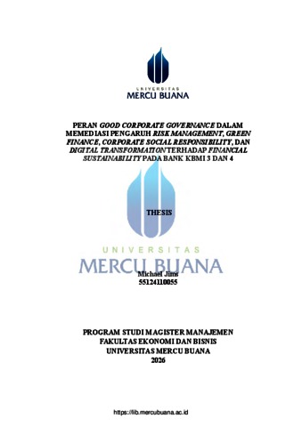 JIMS, MICHAEL (2026) PERAN GOOD CORPORATE GOVERNANCE DALAM MEMEDIASI PENGARUH RISK MANAGEMENT, GREEN FINANCE, CORPORATE SOCIAL RESPONSIBILITY, DAN DIGITAL TRANSFORMATION TERHADAP FINANCIAL SUSTAINABILITY PADA BANK KBMI 3 DAN 4. S2 thesis, Universitas Mercu Buana Jakarta.