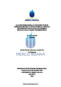 ZAMZAMI, MUHAMMAD ARYAKA (2026) ANALISIS PERBANDINGAN SENTIMEN PUBLIK TERHADAP SRI MULYANI DAN PURBAYA SEBAGAI MENTERI KEUANGAN PADA PLATFORM X MENGGUNAKAN MODEL INDOBERTWEET. S1 thesis, Universitas Mercu Buana Jakarta.