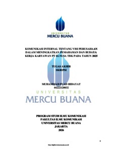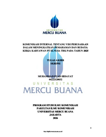 HIDAYAT, MUHAMMAD FUAD (2026) KOMUNIKASI INTERNAL TENTANG VISI PERUSAHAAN DALAM MENINGKATKAN PEMAHAMAN DAN BUDAYA KERJA KARYAWAN PT ELNUSA TBK PADA TAHUN 2025. S1 thesis, UNIVERISTAS MERCU BUANA - BUNCIT.