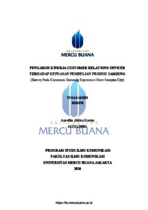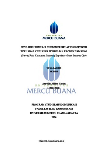 KARIM, AURELLIA ALDIRA (2026) PENGARUH KINERJA CUSTOMER RELATIONS OFFICER TERHADAP KEPUASAN PEMBELIAN PRODUK SAMSUNG (Survey Pada Konsumen Samsung Experience Store Senayan City). S1 thesis, Universitas Mercu Buana Jakarta.