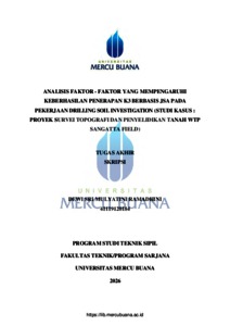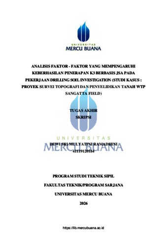 RAMADHINI, DEWI SRI MULYATINI (2026) ANALISIS FAKTOR - FAKTOR YANG MEMPENGARUHI KEBERHASILAN PENERAPAN K3 BERBASIS JSA PADA PEKERJAAN DRILLING SOIL INVESTIGATION (Studi Kasus : Proyek Survei Topografi Dan Penyelidikan Tanah Wtp Sangatta Field). S1 thesis, Universitas Mercu Buana Jakarta.