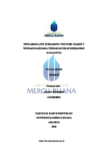 RAMADHAN, ADRIANO (2026) PENGARUH LIVE STREAMING YOUTUBE CHARITY WINDAH BASUDARA TERHADAP SIKAP DERMAWAN MAHASISWA. S1 thesis, Universitas Mercu Buana Jakarta.