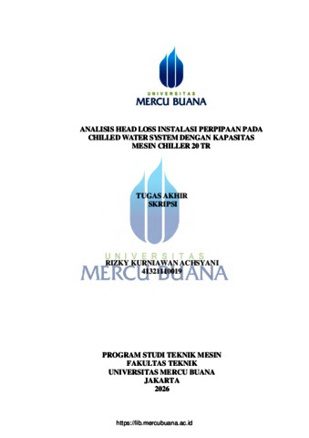 ACHSYANI, RIZKY KURNIAWAN (2026) ANALISIS HEAD LOSS INSTALASI PERPIPAAN PADA CHILLED WATER SYSTEM DENGAN KAPASITAS MESIN CHILLER 20 TR. S1 thesis, Universitas Mercu Buana Jakarta.