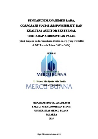 TAUFIK, KHOFIYATUN NIDA (2025) PENGARUH MANAJEMEN LABA, CORPORATE SOCIAL RESPONSIBILITY, DAN KUALITAS AUDITOR EKSTERNAL TERHADAP AGRESIVITAS PAJAK (Studi Empiris pada Perusahaan Sektor Energi yang Terdaftar di BEI Periode Tahun 2015 - 2024). S1 thesis, Universitas Mercu Buana Jakarta.