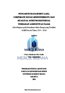 | Uncontrolled Keywords: | Manajemen Laba, Tanggung Jawab Sosial Perusahaan, Kualitas Auditor Eksternal, Agresivitas Pajak. |