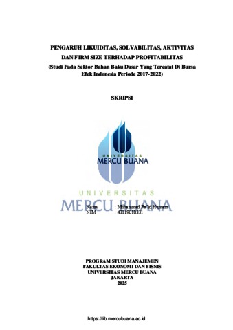 HUMAM, MUHAMMAD RA'ID (2025) PENGARUH LIKUIDITAS, SOLVABILITAS, AKTIVITAS DAN FIRM SIZE TERHADAP PROFITABILITAS (Studi Pada Sektor Bahan Baku Dasar Yang Tercatat Di Bursa Efek Indonesia Periode 2017-2022). S1 thesis, Universitas Mercu Buana Jakarta.