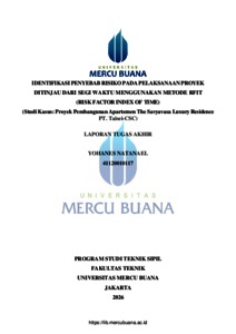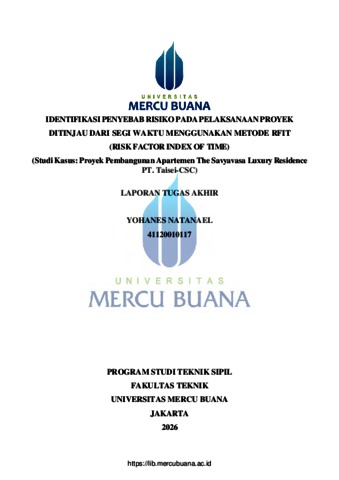 NATANAEL, YOHANES (2026) IDENTIFIKASI PENYEBAB RISIKO PADA PELAKSANAAN PROYEK DITINJAU DARI SEGI WAKTU MENGGUNAKAN METODE RFIT (RISK FACTOR INDEX OF TIME) (Studi Kasus: Proyek Pembangunan Apartemen The Savyavasa Luxury Residence PT. Taisei-CSC). S1 thesis, Universitas Mercu Buana Jakarta.