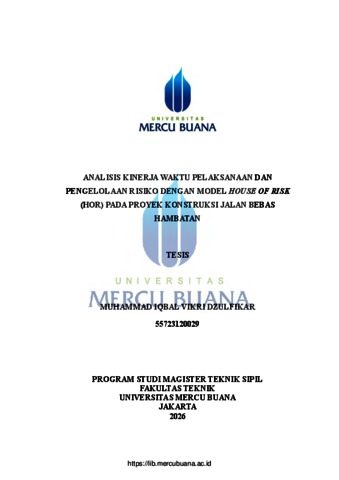 DZ, MUHAMMAD IQBAL VIKRI (2026) ANALISIS KINERJA WAKTU PELAKSANAAN DAN PENGELOLAAN RISIKO DENGAN MODEL HOUSE OF RISK (HOR) PADA PROYEK KONSTRUKSI JALAN BEBAS HAMBATAN. S2 thesis, Universitas Mercu Buana Jakarta.