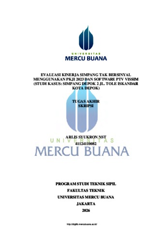 NST, ARLIS SYUKRON (2026) EVALUASI KINERJA SIMPANG TAK BERSINYAL MENGGUNAKAN PKJI 2023 DAN SOFTWARE PTV VISSIM (STUDI KASUS: SIMPANG DEPOK 2 JL. TOLE ISKANDAR KOTA DEPOK). S1 thesis, UNIVERISTAS MERCU BUANA - BUNCIT.