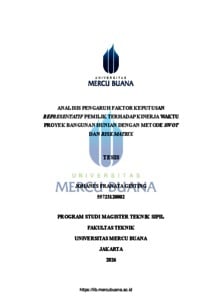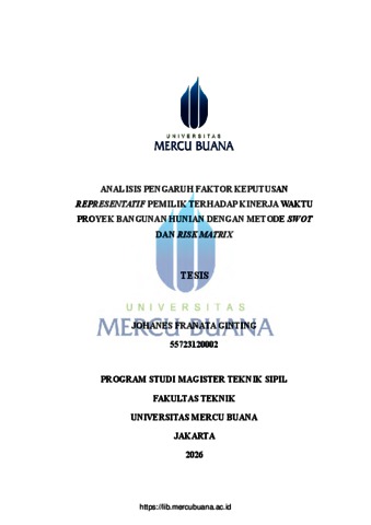 GINTING, JOHANES FRANATA (2026) ANALISIS PENGARUH FAKTOR KEPUTUSAN REPRESENTATIF PEMILIK TERHADAP KINERJA WAKTU PROYEK BANGUNAN HUNIAN DENGAN METODE SWOT DAN RISK MATRIX. S2 thesis, Universitas Mercu Buana Jakarta.