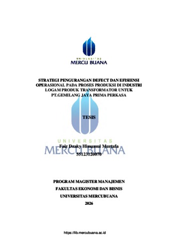 MURTAFA, FAIZ DZAKY HIMAMUL (2026) STRATEGI PENGURANGAN DEFECT DAN EFISIENSI OPERASIONAL PADA PROSES PRODUKSI DI INDUSTRI LOGAM PRODUK TRANSFORMATOR UNTUK PT.GEMILANG JAYA PRIMA PERKASA. S2 thesis, Universitas Mercu Buana Jakarta.