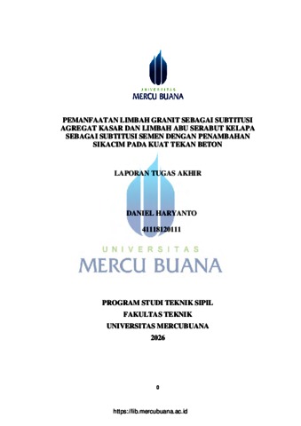HARYANTO, DANIEL (2026) PEMANFAATAN LIMBAH GRANIT SEBAGAI SUBTITUSI AGREGAT KASAR DAN LIMBAH ABU SERABUT KELAPA SEBAGAI SUBTITUSI SEMEN DENGAN PENAMBAHAN SIKACIM PADA KUAT TEKAN BETON. S1 thesis, Universitas Mercu Buana Jakarta.