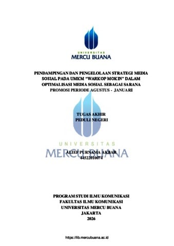 AKBAR, ALIEF PURNAMA (2026) PENDAMPINGAN DAN PENGELOLAAN STRATEGI MEDIA SOSIAL PADA UMKM "WARKOP MOKIN" DALAM OPTIMALISASI MEDIA SOSIAL SEBAGAI SARANA PROMOSI PERIODE AGUSTUS - JANUARI. S1 thesis, Universitas Mercu Buana Jakarta.