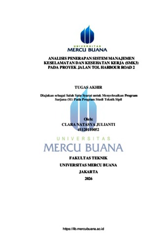 JULIANTI, CLARA NATASYA (2026) ANALISIS PENERAPAN SISTEM MANAJEMEN KESELAMATAN DAN KESEHATAN KERJA (SMK3)PADA PROYEK JALAN TOL HARBOUR ROAD 2. S1 thesis, Universitas Mercu Buana Jakarta.