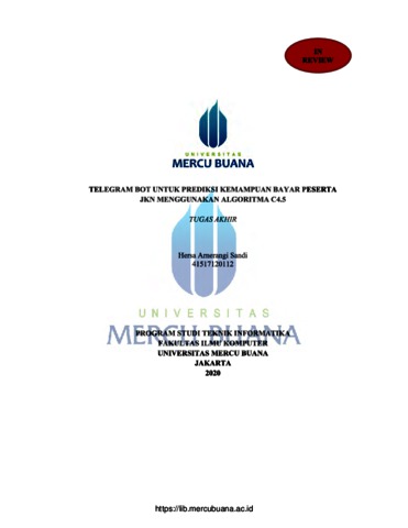 SANDI, HERSA ARNERANGI (2020) TELEGRAM BOT UNTUK PREDIKSI KEMAMPUAN BAYAR PESERTA JKN MENGGUNAKAN ALGORITMA C4.5. S1 thesis, Universitas Mercu Buana Jakarta.