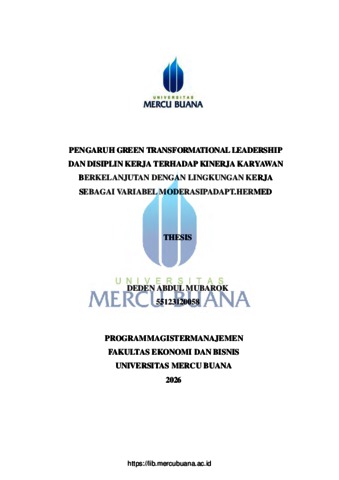 MUBAROK, DEDEN ABDUL (2026) PENGARUH GREEN TRANSFORMATIONAL LEADERSHIP DAN DISIPLIN KERJA TERHADAP KINERJA KARYAWAN BERKELANJUTAN DENGAN LINGKUNGAN KERJA SEBAGAI VARIABEL MODERASI PADA PT.HERMED. S2 thesis, Universitas Mercu Buana Jakarta.