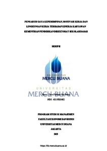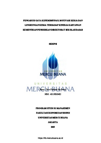 FAUZY, DEVA PRATAMA NUR (2025) PENGARUH GAYA KEPEMIMPINAN, MOTIVASI KERJA DAN LINGKUNGAN KERJA TERHADAP KINERJA KARYAWAN KEMENTRIAN PENDIDIKAN DIREKTORAT SEKOLAH DASAR. S1 thesis, Universitas Mercu Buana Jakarta.