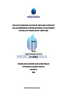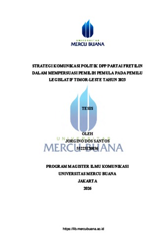 SANTOS, JORGINO DOS (2026) STRATEGI KOMUNIKASI POLITIK DPP PARTAI FRETILIN DALAM MEMPERSUASI PEMILIH PEMULA PADA PEMILU LEGISLATIF TIMOR-LESTE TAHUN 2023. S2 thesis, Universitas Mercu Buana Jakarta.