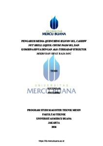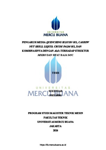 SUKENDAR, SUKENDAR (2026) PENGARUH MEDIA QUENCHING SILICON OIL, CASHEW NUT SHELL LIQUID, CRUDE PALM OIL, DAN KOMBINASINYA DENGAN Al2O3 TERHADAP STRUKTUR MIKRO DAN SIFAT BAJA. S2 thesis, Universitas Mercu Buana Jakarta.