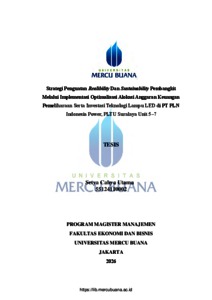 This Capstone Project discusses strategies to strengthen the Realability and Sustainability of power plant operations through the implementation of optimizing the allocation of maintenance budgets and investment in LED lighting technology at PT PLN Indonesia Power, PLTU Suralaya Units 5–7, which will be implemented in the 2023–2027 period. The problem faced is the use of suboptimal maintenance budgets, which leads to an increase in the frequency of interruptions, decreased performance, and high operational costs. The proposed strategy includes evaluation of maintenance financing patterns, priority mapping of technical needs, and the application of critical asset performance-based budget management methods. With this strategy, the use of ineffective costs can be minimized and the available funds can be focused on activities that directly contribute to improving the reliability of the generating unit. The goal of the budget optimization obtained during the 2023–2027 period is then allocated for investment in energy-efficient LED lighting technology to reduce internal electricity consumption, reduce operational costs, and support the company's energy efficiency targets. The use of LED lights is also in line with sustainability initiatives through reducing emissions, eliminating the risk of environmental pollution (B3 waste) and more efficient use of resources. The implementation of this strategy can result in increased reliability, long-term cost savings, and strengthen PT PLN Indonesia Power's commitment to sustainable operations. Keywords: reliability, sustainability, budget optimization, maintenance, LED lights, energy efficiency. Capstone Project ini membahas terkait strategi penguatan Realibility dan Sustainability operasional pembangkit listrik melalui implementasi optimalisasi alokasi anggaran pemeliharaan serta investasi teknologi lampu LED di PT PLN Indonesia Power, PLTU Suralaya Unit 5–7, yang pelaksanaannya pada periode tahun 2023–2027. Permasalahan yang dihadapi adalah penggunaan anggaran pemeliharaan yang kurang optimal, yang menyebabkan peningkatan frekuensi gangguan, penurunan performa, dan berimplikasi pada biaya operasional yang tinggi. Strategi yang diusulkan meliputi evaluasi terhadap pola pembiyaan pemeliharaan, pemetaan prioritas kebutuhan teknis, dan penerapan metode pengelolaan anggaran berbasis kinerja critical asset. Dengan strategi ini, penggunaan biaya yang tidak efektif dapat diminimalkan dan dana yang tersedia dapat difokuskan pada kegiatan yang memberikan kontribusi langsung terhadap peningkatan reliabilitas unit pembangkit. Tujuan dari optimasi anggaran yang diperoleh selama periode 2023–2027, kemudian dialokasikan untuk investasi teknologi lampu LED hemat energi guna mengurangi konsumsi listrik internal, menekan beban biaya operasional, dan mendukung target efisiensi energi perusahaan. Penggunaan lampu LED juga sejalan dengan inisiatif keberlanjutan melalui pengurangan emisi, menghilangkan risiko pencemaran lingkungan (limbah B3) dan penggunaan sumber daya yang lebih efisien. Dengan implementasi strategi ini dapat menghasilkan peningkatan keandalan, penghematan biaya jangka panjang, serta memperkuat komitmen PT PLN Indonesia Power terhadap operasional yang berkelanjutan. Kata kunci: reliabilitas, keberlanjutan, optimalisasi anggaran, pemeliharaan, lampu LED, efisiensi energi.