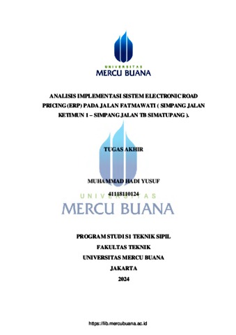 YUSUF, MUHAMMAD HADI (2024) ANALISIS IMPLEMENTASI SISTEM ELECTRONIC ROAD PRICING (ERP) PADA JALAN FATMAWATI (SIMPANG JALAN KETIMUN 1 - SIMPANG JALAN TB SIMATUPANG). S1 thesis, Universitas Mercu Buana Jakarta.