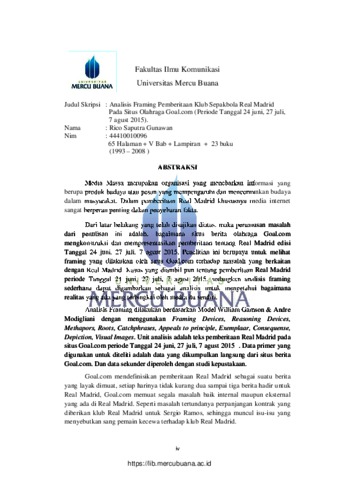 Mass Media is an organization that spread information in the form of cultural products or messages that affect and reflect the culture in the community. Real Madrid in the news media, especially the Internet plays an important role in the dissemination of facts. From the background that has been presented above, the formulation of the problem of this paper is: how to construct Goal.com sports news sites and presenting the news about Real Madrid edition On 24 June, 27 July, 7 agust 2015. This study attempted to see the framing is done by Goal.com website to problems related to Real Madrid. Case taken anything about Real Madrid reporting period On 24 June, 27 July, 7, 2015. agust while framing simple analysis can be described as an analysis to determine how the existing reality framed by the media itself. Framing analysis is based on the Model of William Gamson and Andre Modigliani using Framing Devices, Devices Reasoning, Methapors, Roots, catchphrases, Appeals to principle, Exemplaar, Consequense, depiction, Visual Images. The unit of analysis is the text of the news Real Madrid at the site Goal.com period On 24 June, 27 July, 7 agust 2015. The primary data used for the study is that the data collected directly from the Goal.com news site. And secondary data obtained with the study of literature. Goal.com Real Madrid defines news as a news worthy loaded, every day not less than two to three news comes to Real Madrid, Goal.com includes all internal and external problems in Real Madrid. Such problems delayed the contract extension given to the club Real Madrid Sergio Ramos, so that emerging issues that mention the disappointment of the club's player of Real Madrid Media Massa merupakan organisasi yang menebarkan informasi yang berupa produk budaya atau pesan yang mempengaruhi dan mencerminkan budaya dalam masyarakat. Dalam pemberitaan Real Madrid khususnya media internet sangat berperan penting dalam penyebaran fakta. Dari latar belakang yang telah disajikan diatas, maka perumusan masalah dari penulisan ini adalah: bagaimana situs berita olahraga Goal.com mengkonstruksi dan mempresentasikan pemberitaan tentang Real Madrid edisi Tanggal 24 juni, 27 juli, 7 agust 2015. Penelitian ini berupaya untuk melihat framing yang dilakukan oleh situs Goal.com terhadap masalah yang berkaitan dengan Real Madrid. Kasus yang diambil pun tentang pemberitaan Real Madrid periode Tanggal 24 juni, 27 juli, 7 agust 2015. sedangkan analisis framing sederhana dapat digambarkan sebagai analisis untuk mengetahui bagaimana realitas yang ada yang terbingkai oleh media itu sendiri. Analisis Framing dilakukan berdasarkan Model William Gamson & Andre Modigliani dengan menggunakan Framing Devices, Reasoning Devices, Methapors, Roots, Catchphrases, Appeals to principle, Exemplaar, Consequense, Depiction, Visual Images. Unit analisis adalah teks pemberitaan Real Madrid pada situs Goal.com periode Tanggal 24 juni, 27 juli, 7 agust 2015 . Data primer yang digunakan untuk diteliti adalah data yang dikumpulkan langsung dari situs berita Goal.com. Dan data sekunder diperoleh dengan studi kepustakaan. Goal.com mendefinisikan pemberitaan Real Madrid sebagai suatu berita yang layak dimuat, setiap harinya tidak kurang dua sampai tiga berita hadir untuk Real Madrid, Goal.com memuat segala masalah baik internal maupun eksternal yang ada di Real Madrid. Seperti masalah tertundanya perpanjangan kontrak yang diberikan klub Real Madrid untuk Sergio Ramos, sehingga muncul isu-isu yang menyebutkan sang pemain kecewa terhadap klub Real Madrid.