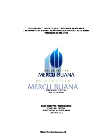 In this massive development of automotive era, many users feel not enough satisfy with their vehicle especially for Vespa user. Two-wheelers vehicle like Vespa has bad performance in order their lifespan and worn-out engine components that affecting its component become not maximal. One of things that affecting engine performance is Cylinder Kit which located in engine itself and has different sizes. The purpose of this research is knowing the effect by replacing Cylinder Vespa with using 144cc Cylinder Kit Quattrini of power and torque by Dyno Test for knowing how much will happen to Vespa PTS. Certainly by conducted several disassembly steps and tuning when assembling 144cc Cylinder Kit Quattrini of Vespa PTS engine. Testing methods are carried out in accordance with stages & procedures. The results of dynotest method are produced graphic data and tables that contained power, torque & RPM. From the results of the dynotest test, the replacement of the Vespa PTS cylinder block with the Quattrini Cylinder Kit and also the replacement of the carburetor greatly affects the value of power and torque on the engine, where the power analysis is higher than the Vespa Excel 150cc which reaches a maximum power of 5.2 HP at 7,739 rotation. RPM, while the Quattrini 144cc Cylinder Kit reaches a maximum power of 18.4 HP at 7,459 RPM, a difference of 13.2 HP. Likewise with the effect of higher torque than the Vespa Excel 150cc where it reaches a maximum torque of 6.4 Nm at 5,264 RPM, while the Quattrini 144cc Cylinder Kit reaches a maximum torque of 18.2 Nm at 6,876 RPM rotation, a difference of 11.8 Keywords: Vespa 150cc, 144cc Cylinder Kit Quattrini, Dynotest, Power, Torque. Di era perkembangan dunia otomotif yang sangat ramai sekarang banyak pengguna kendaraan merasa kurang puas dengan performa kendaraannya khususnya pada sepeda motor Vespa. Performa kendaraan sepeda motor roda dua jenis Vespa ini berkurang dikarenakan usia dan komponen mesin yang aus sehingga kerja komponen itu kurang maksimal. Salah satu hal yang mempengaruhi performa mesin yaitu Cylinder Kit yang terdapat pada mesin dimana silinder ini memiliki ukuran yang berbeda-beda. Tujuan penelitian ini bagaimana pengaruh penggantian Cylinder Vespa dengan menggunakan Cylinder Kit Quattrini 144cc terhadap daya dan torsi dengan menggunakan pengujian Dynotest untuk mengetahui seberapa besar yang terjadi pada mesin Vespa PTS. Tentunya dengan melakukan beberapa tahapan pelepasan dan penyesuaian ketika pemasangan Cylinder Kit Quattrini 144cc terhadap mesin Vespa PTS. Metode pengujian dilakukan sesuai dengan tahapan dan prosedur. Hasil dari metode pengujian dynotest menghasilkan data grafik dan tabel yang didalamnya terdapat daya, torsi dan rpm. Dari hasil pengujian dynotest penggantian blok silinder Vespa PTS dengan Cylinder Kit Quattrini dan juga penggantian karburator sangat berpengaruh pada nilai daya dan torsi pada engine tersebut, dimana didapat analisa daya lebih tinggi daripada Vespa Excel 150cc dimana mencapai daya maksimum sebesar 5,2 HP pada putaran 7.739 RPM, sedangkan Cylinder Kit Quattrini 144cc mencapai daya maksimum sebesar 18,4 HP pada putaran 7.459 RPM selisih 13,2 HP. Begitupun dengan pengaruh torsi lebih tinggi daripada Vespa Excel 150cc dimana mencapai torsi maksimum sebesar 6,4 Nm pada putaran 5.264RPM, sedangkan Cylinder Kit Quattrini 144cc mencapai torsi maksimum sebesar 18,2 Nm pada putaran 6.876 RPM selisih 11,8. Kata Kunci: Vespa 150cc, Cylinder Kit Quattrini 144cc, Dynotest, Daya, Torsi