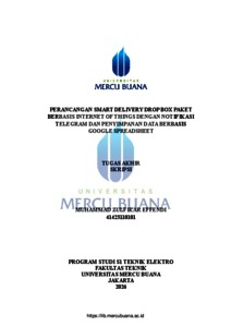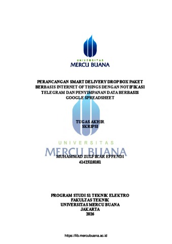 EFFENDI, MUHAMMAD ZULFIKAR (2026) PERANCANGAN SMART DELIVERY DROP BOX PAKET BERBASIS INTERNET OF THINGS DENGAN NOTIFIKASI TELEGRAM DAN PENYIMPANAN DATA BERBASIS GOOGLE SPREADSHEET. S1 thesis, Universitas Mercu Buana Jakarta.