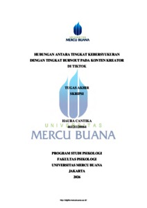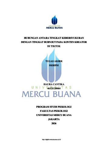 CANTIKA, HAURA (2026) HUBUNGAN ANTARA TINGKAT KEBERSYUKURAN DENGAN TINGKAT BURNOUT PADA KONTEN KREATOR DI TIKTOK. S1 thesis, UNIVERISTAS MERCU BUANA - BUNCIT.