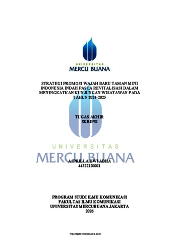 ADHA, ASPRILLA DWI (2026) STRATEGI PROMOSI WAJAH BARU TAMAN MINI INDONESIA INDAH PASCA REVITALISASI DALAM MENINGKATKAN KUNJUNGAN WISATAWAN PADA TAHUN 2024-2025. S1 thesis, UNIVERISTAS MERCU BUANA - BUNCIT.