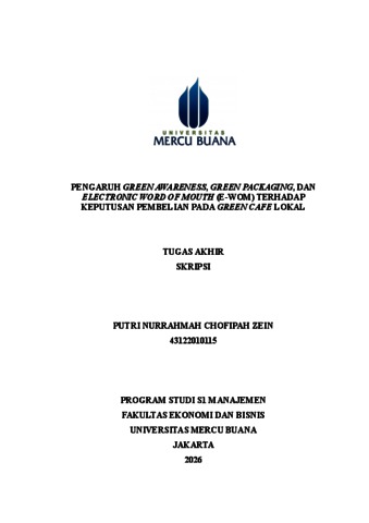 ZEIN, PUTRI NURRAHMAH CHOFIPAH (2026) PENGARUH GREEN AWARENESS, GREEN PACKAGING, DAN ELECTRONIC WORD OF MOUTH (E-WOM) TERHADAP KEPUTUSAN PEMBELIAN PADA GREEN CAFE LOKAL. S1 thesis, Universitas Mercu Buana Jakarta.