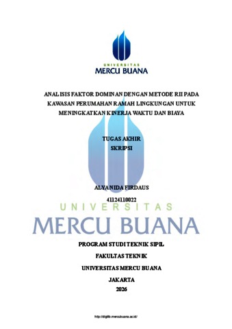 FIRDAUS, ALYA NIDA (2026) ANALISIS FAKTOR DOMINAN DENGAN METODE RII PADA KAWASAN PERUMAHAN RAMAH LINGKUNGAN UNTUK MENINGKATKAN KINERJA WAKTU DAN BIAYA. S1 thesis, UNIVERISTAS MERCU BUANA - BUNCIT.