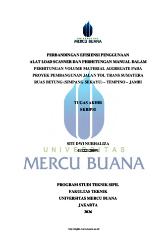 NURHALIZA, SITI DWI (2026) PERBANDINGAN EFISIENSI PENGGUNAAN ALAT LOAD SCANNER DAN PERHITUNGAN MANUAL DALAM PERHITUNGAN VOLUME MATERIAL AGGREGATE PADA PROYEK PEMBANGUNAN JALAN TOL TRANS SUMATERA RUAS BETUNG (SIMPANG SEKAYU) – TEMPINO – JAMBI. S1 thesis, UNIVERISTAS MERCU BUANA - BUNCIT.