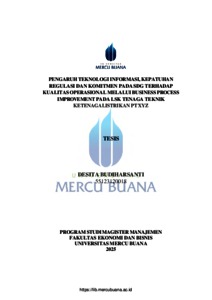 BUDIHARSANTI, DESITA (2025) PENGARUH TEKNOLOGI INFORMASI, KEPATUHAN REGULASI DAN KOMITMEN PADA SDG TERHADAP KUALITAS OPERASIONAL MELALUI BUSINESS PROCESS IMPROVEMENT PADA LSK TENAGA TEKNIK KETENAGALISTRIKAN PT XYZ. S2 thesis, Universitas Mercu Buana Jakarta.