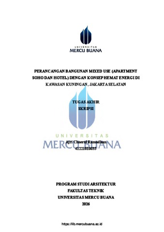 RAMADHAN, AJRI CHAERUL (2026) PERANCANGAN BANGUNAN MIXED USE (APARTMENT SOHO DAN HOTEL) DENGAN KONSEP HEMAT ENERGI DI KAWASAN KUNINGAN, JAKARTA SELATAN. S1 thesis, Universitas Mercu Buana Jakarta.