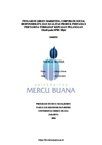 ZAHRAH, ADISTIA (2026) PENGARUH GREEN MARKETING, CORPORATE SOCIAL RESPONSIBILITY, DAN KUALITAS PRODUK PERTAMAX PERTAMINA TERHADAP KEPUASAN PELANGGAN (Studi pada SPBU Slipi). S1 thesis, Universitas Mercu Buana Jakarta.