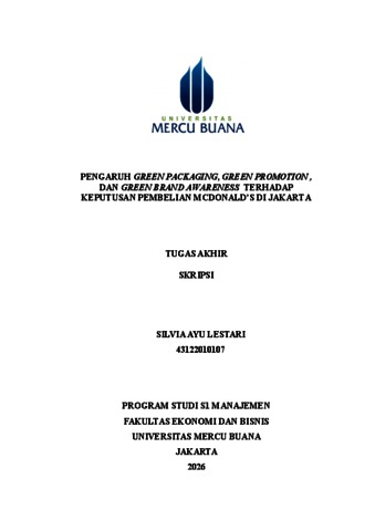 LESTARI, SILVIA AYU (2026) PENGARUH GREEN PACKAGING, GREEN PROMOTION , DAN GREEN BRAND AWARENESS TERHADAP KEPUTUSAN PEMBELIAN MCDONALD'S DI JAKARTA. S1 thesis, Universitas Mercu Buana Jakarta.